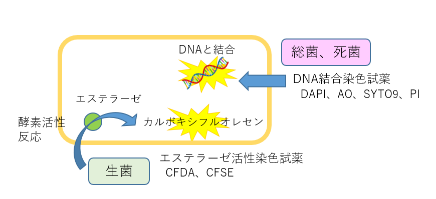 細胞内のエステラーゼ活性を指標とするCFDA(carboxyfluorescein diacetate)は生菌の検出に適しており、細胞内に取り込まれたCFDAがエステラーゼによって加水分解されることで蛍光性物質となる。また、膜透過性を有しDNAやRNAといった核酸に結合するAO(acridine