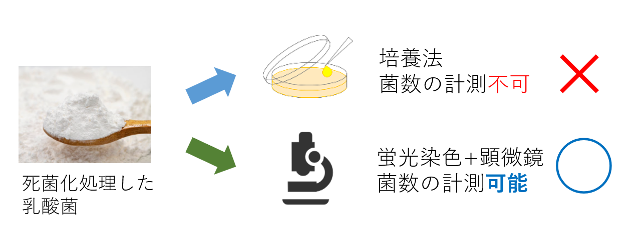 乳酸菌のように死菌状態でも、人に良い影響を与える(生体機能を改善する)菌が存在する。死菌状態の乳酸菌を計測しようとした場合、培養法では検出することは不可能である。蛍光染色法であれば、総菌や死菌の染色試薬を使うことで計測が可能となる。