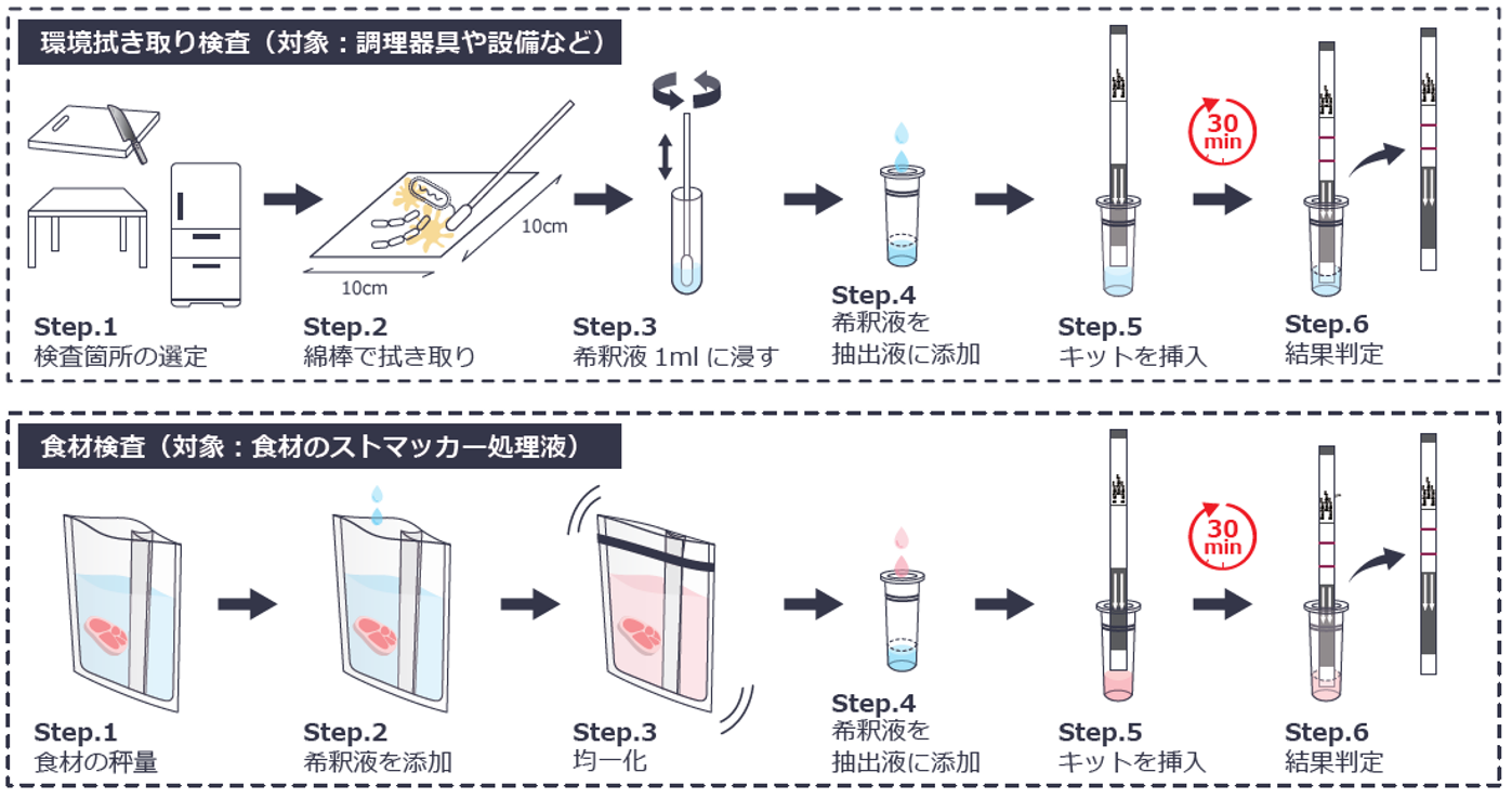まな板・包丁などの調理器具の綿棒拭き取り液や、生鮮食品・総菜などの食材抽出液を試料液として使用し、30分で簡便に結果が得られます。